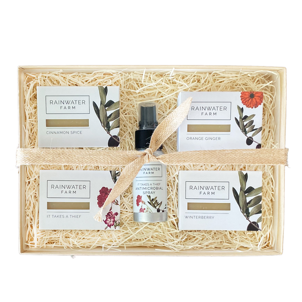 Savor the scents of the season with this gift set! This gift set includes our It Takes a Thief Soap, Winterberry Soap, Orange Ginger Soap, and Cinnamon Spice Soap, as well as our 2-oz It Takes a Thief Antimicrobial Spray. Filled with the aromas of the season, these products will bring warmth and comfort to the homes of you and your loved ones. Additionally, our It Takes a Thief Soap and Spray contain antimicrobial properties to keep you and your loved ones healthy all winter long!